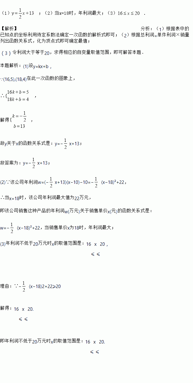 (3)试通过(2)中的函数关系式及其大致图象,帮助该公司确定产品的销售单价范围,使年利润不低于20万元(请直接写出销售单价