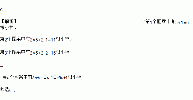 如图是用长度相等的小棒按一定规律摆成的一组图案,第1个图案中有6根小棒,第2个图案中有11根小棒,…,则第n个图案中有( )根小棒.