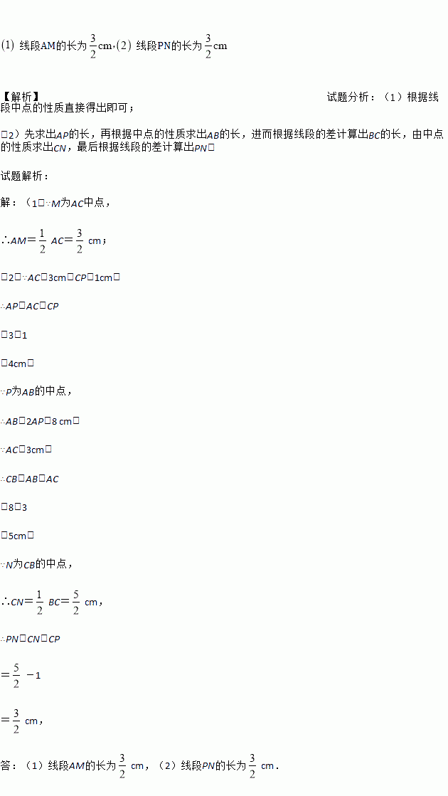 如图,点C是线段AB上一点,点M、N、P分别是线段AC、BC、AB的中点, ,求: