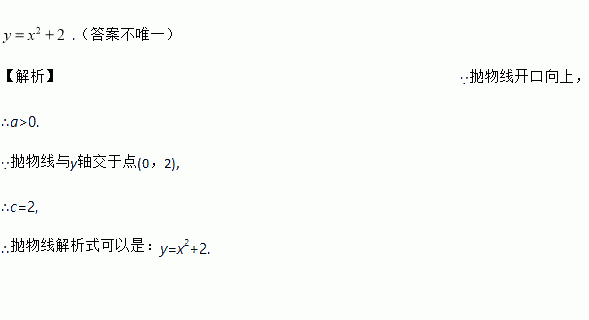 .(答案不唯一) 【解析】∵抛物线开口向上, ∴a>0. ∵抛物线与y轴交于点(0,2), ∴c=2, ∴抛物线解析式可以是:y=x2+2.