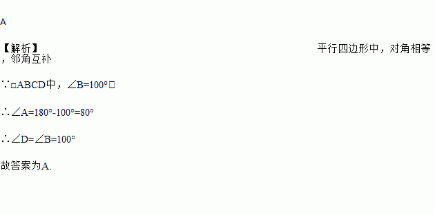 □ABCD中,如果∠B=100°,那么∠A、∠D的值分别是( )