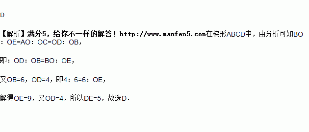 如图, 梯形ABCD中,AD∥BC,对角线的交点为O,CE∥AB交BD的延长线于E,若OB=6,OD=4,则DE=( )