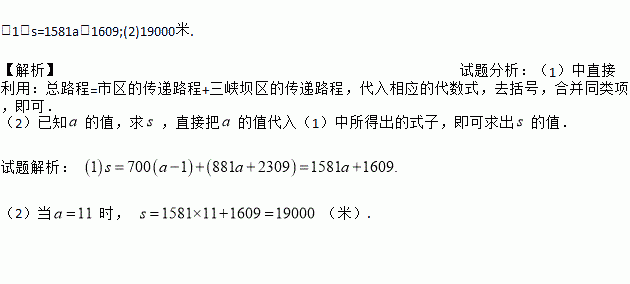 (1)s=1581a+1609;(2)19000米. 【解析】试题分析:(1)中直接利用:总路程=市区的传递路程+三峡坝区的传递路程,代入相应的代数式,去括号,合并同类项,即可. (2)已知的值,求,直接把的值代入(1)中所得出的式子,即可求出的值. 试题解析: (2)当时, (米).