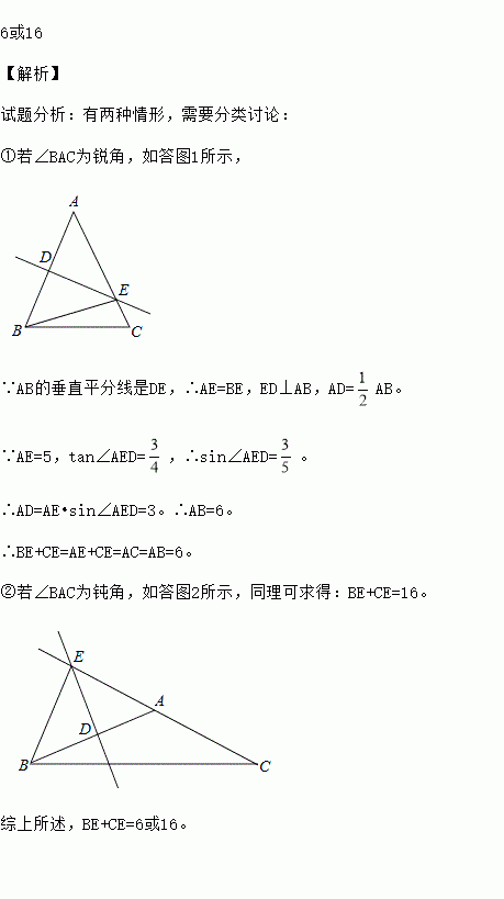 在△ABC中,AB=AC,AB的垂直平分线DE与AC所在的直线相交于点E,垂足为D,连接BE.已知AE=5,tan∠AED=