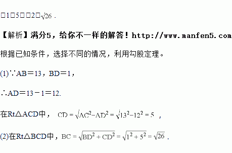 如图,在△ABC中,CD⊥AB于D,AB=AC=13,BD=1.求:(1)CD的长;(2)BC的长.