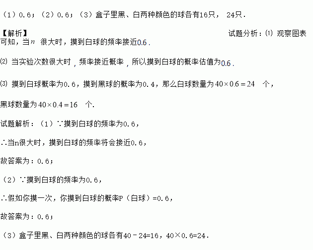 (1)0.6;(2)0.6;(3)盒子里黑、白两种颜色的球各有16只, 24只. 【解析】试题分析:⑴ 观察图表可知,当 很大时,摸到白球的频率接近0.6 . ⑵ 当实验次数很大时,频率接近概率,所以摸到白球的概率估值为0.6 . ⑶ 摸到白球概率为0.6,摸到黑球的概率为0.4,那么白球数量为 个, 黑球数量为 个. 试题解析:(1)∵摸到白球的频率为0.6, ...