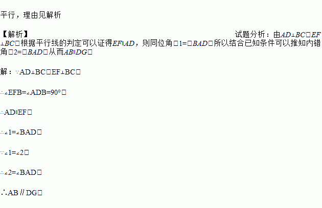 如图,已知AD⊥BC,EF⊥BC,∠1=∠2.试问DG与BA是否平行?说明你的理由.