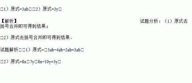 (1)原式=3ab;(2)原式=3y. 【解析】试题分析:(1)原式去括号合并即可得到结果; (2)原式去括号合并即可得到结果. 试题解析:(1)原式=﹣3ab+4ab+2ab=3ab; (2)原式=8x﹣7y﹣8x+10y=3y.