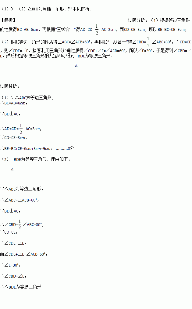 如图,在等边三角形ABC中,BD⊥AC于D,延长BC到E,使CE=CD,AB=6cm. (1)求BE的长; (2)判断△BDE的形状,并说明理由.
