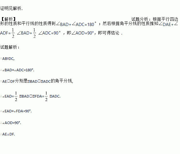 如图,四边形ABCD中,AB∥DC,AE,DF分别是∠BAD,∠ADC的平分线,AE,DF交于点O.