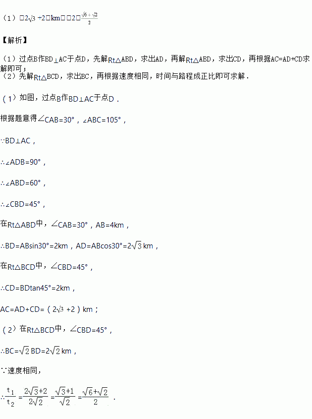 如图,在一笔直的沿湖道路上有A、B两个游船码头,观光岛屿C在码头A北偏东60°的方向,在码头B北偏东15°的方向,AB=4km.