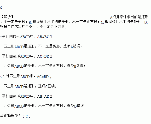 A. 若AB⊥BC,则平行四边形ABCD是菱形 B. 若AC⊥BD,则平行四边形ABCD是正方形