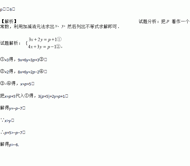 若关于x的方程组的解满足x>y,求p的取值范围.