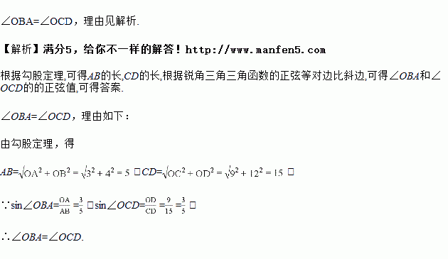 已知如图,A,B,C,D四点的坐标分别是(3,0),(0,4),(12,0),(0,9),探索∠OBA和∠OCD的大小关系,并说明理由.