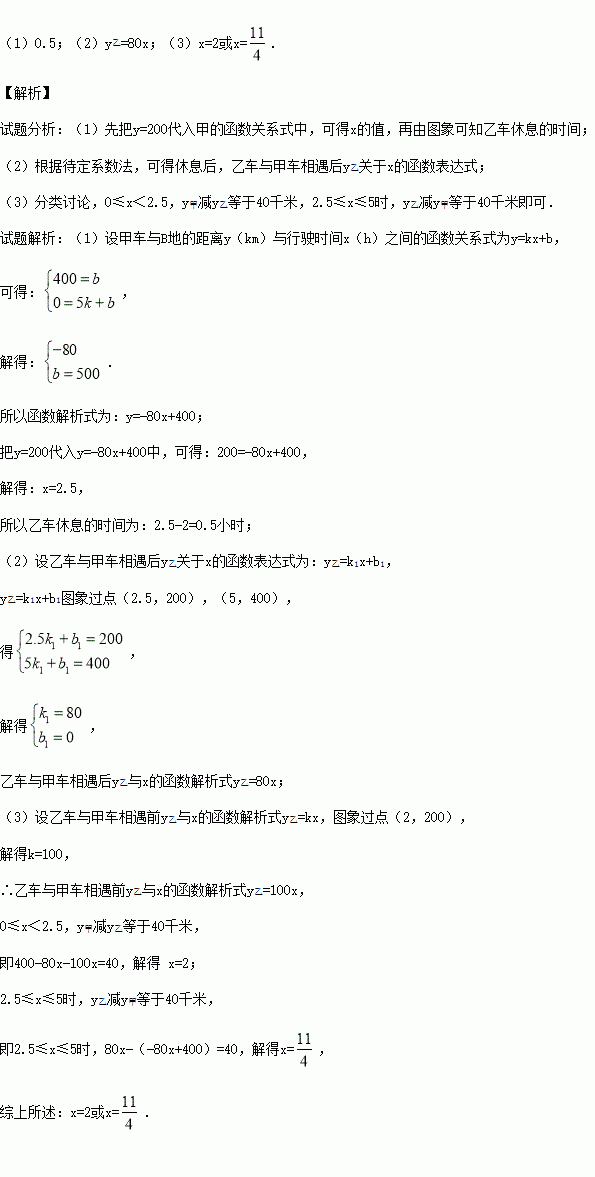甲、乙两辆汽车分别从A、B两地同时出发,沿同一条公路相向而行,乙车出发2h后休息,与甲车相遇后,继续行驶.设甲、乙两车与B地的路程分别为y甲(km),y乙(km),甲车行驶的时间为x(h),y甲、y乙与x之间的函数图象如图所示,结合图象解答下列问题: