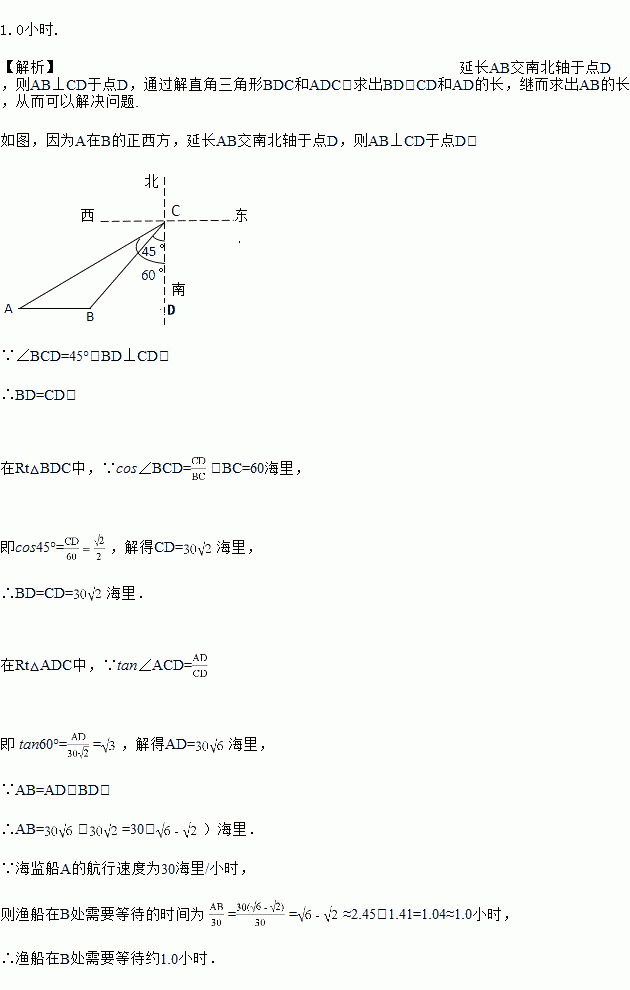 如图所示,在某海域,一般指挥船在C处收到渔船在B处发出的求救信号,经确定,遇险抛锚的渔船所在的B处位于C处的南偏西45°方向上,且BC=60海里;指挥船搜索发现,在C处的南偏西60°方向上有一艘海监船A,恰好位于B处的正西方向.于是命令海监船A前往搜救,已知海监船A的航行速度为30海里/小时,问渔船在B处需要等待多长时间才能得到海监船A的救援?(参考数据:
