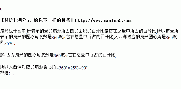 大西洋的面积约占大洋总面积的25%,若用扇形统计图表示各大洋的面积占大洋总面积的百分比,大西洋对应的扇形圆心角的度数为 ( )