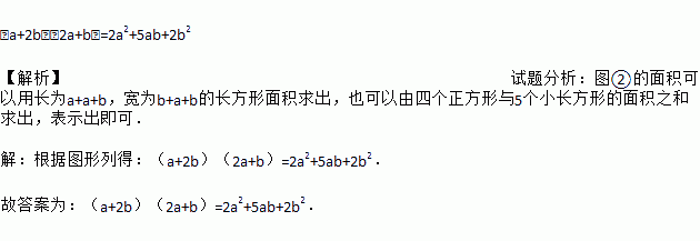 在我们所学的课本中,多项式与多项式相乘可以用几何图形的面积来表示.例如,(2a+b)(a+b)=2a2+3ab+b2就可以用图(1)来表示.请你根据此方法写出图(2)中图形的面积所表示的代数恒等式:____________.