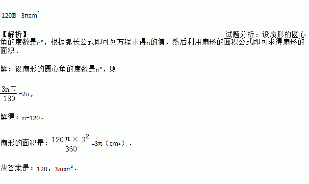 120; 3πcm2 【解析】试题分析:设扇形的圆心角的度数是n°,根据弧长公式即可列方程求得n的值,然后利用扇形的面积公式即可求得扇形的面积. 【解析】 设扇形的圆心角的度数是n°,则 =2π, 解得:n=120, 扇形的面积是:=3π(cm2). 故答案是:120,3πcm2.