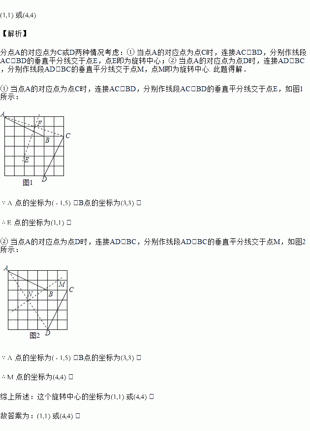 如图,线段AB两端点坐标分别为A(﹣1,5)、B(3,3),线段CD两端点坐标分别为C(5,3)、D (3,﹣1)数学课外兴趣小组研究这两线段发现:其中一条线段绕着某点旋转一个角度可得到另一条线段,请写出旋转中心的坐标________.