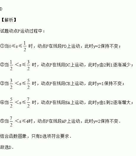 如图,在平面直角坐标系中,边长为1的正方形ABCD中,AD边的中点处有一动点P,动点P沿P→D→C→B→A→P运动一周,则P点的纵坐标y与点P走过的路程s之间的函数关系用图象表示大致是( )