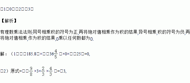 计算:(1)(﹣185.8)×(﹣36)×0×(﹣25);(2)(﹣1)×3(﹣)×(﹣1).
