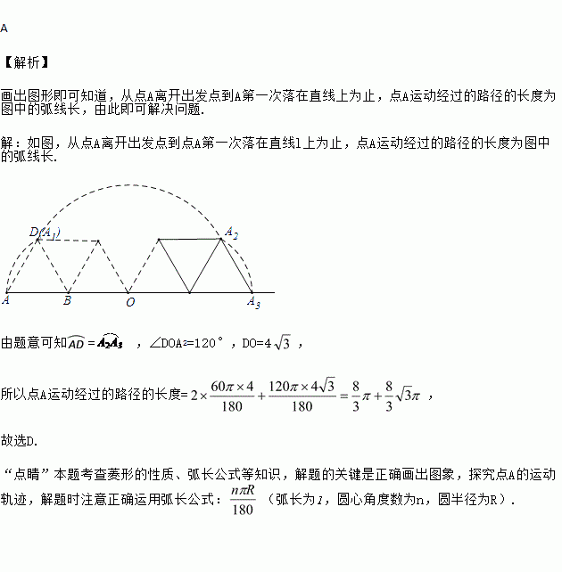 如图,菱形ABCD放置在直线l上(AB与直线l重合),AB=4,∠DAB=60°,将菱形ABCD沿直线l向右无滑动地在直线l上滚动,从点A离开出发点到点A第一次落在直线l上为止,点A运动经过的路径总长度为( )