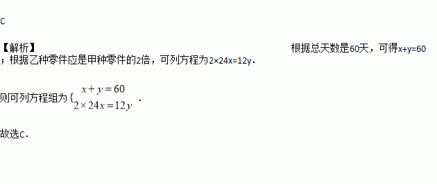 玩具车间每天能生产甲种玩具零件24个或乙种玩具零件12个,若甲种玩具零件一个与乙种玩具零件2个能组成一个完整的玩具,怎样安排生产才能在60天内组装出最多的玩具设生产甲种玩具零件x天,乙种玩具零件y天,则有( )