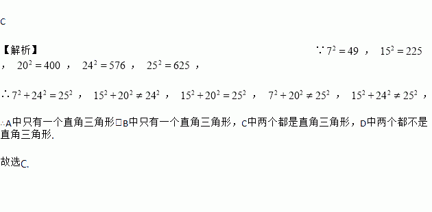 有五根小木棒,其长度分别为7,15,20,24,25,现将它们摆成两个直角三角形,其中正确的是( )