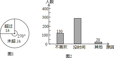 为了开展阳光体育运动,坚持让中小学生“每天锻炼一小时”,某市教体局做了一个随机调查,调查内容是:每天锻炼是否超过1h及锻炼未超过1h的原因.他们随机调查了600名学生,用所得的数据制成了扇形统计图和频数分布直方图(图1、图2).