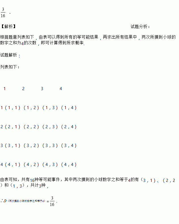 . 【解析】试题分析: 根据题意列表如下,由表可以得到所有的等可能结果,再求出所有结果中,两次所摸到小球的数字之和为4的次数,即可计算得到所求概率. 试题解析: 列表如下: 1 2 3 4 1 (1,1) (1,2) (1,3) (1,4) 2 (2,1) (2,2) (2,3) ...