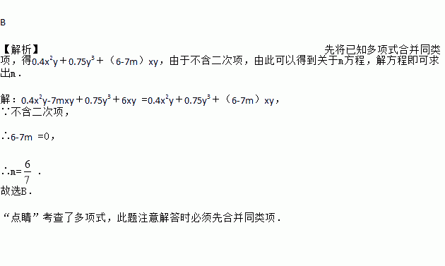 若关于x,y的多项式0.4x2y﹣7mxy+0.75y3+6xy化简后不含二次项,则m=( )