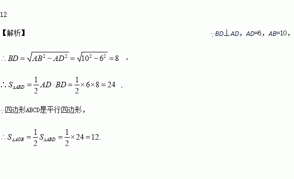 如图,在平行四边形ABCD中,对角线AC与BD相交于点O,BD⊥AD,AD=6,AB=10,则△AOB的面积为 _________________
