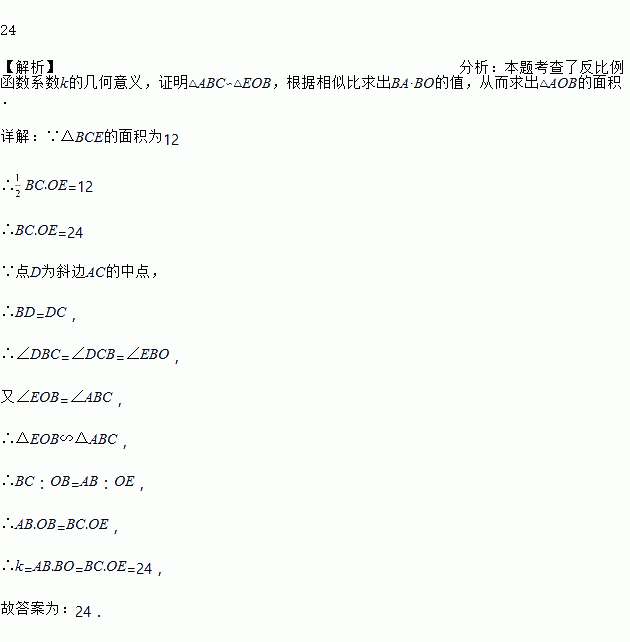 (x<0) 上,作 Rt△ABC,点 D 是斜边 AC 的中点,连 DB 并延长交 y 轴于点E,若△BCE 的面积为 12,则 k 的值为_____.