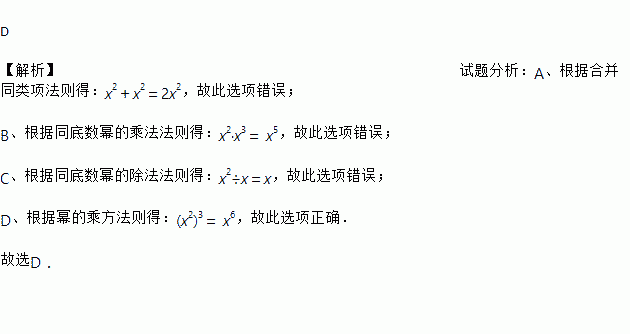 D 【解析】试题分析:A、根据合并同类项法则得:x2+x2=2x2,故此选项错误; B、根据同底数幂的乘法法则得:x2·x3= x5,故此选项错误; C、根据同底数幂的除法法则得:x2÷x=x,故此选项错误; D、根据幂的乘方法则得:(x2)3= x6,故此选项正确. 故选D.