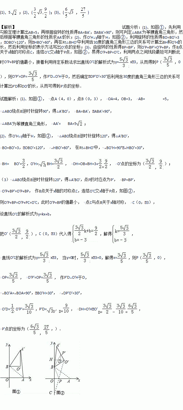 (3)在(2)的条件下,边OA上 的一点P旋转后的对应点为P′,当O′P+BP′取得最小值时,求点P′的坐标(直接写出结果即可)