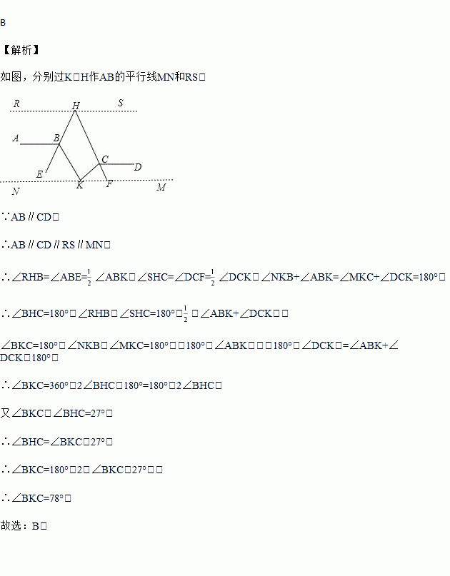 如图,AB∥CD,∠ABK的角平分线BE的反向延长线和∠DCK的角平分线CF的反向延长线交于点H,∠K﹣∠H=27°,则∠K=( )