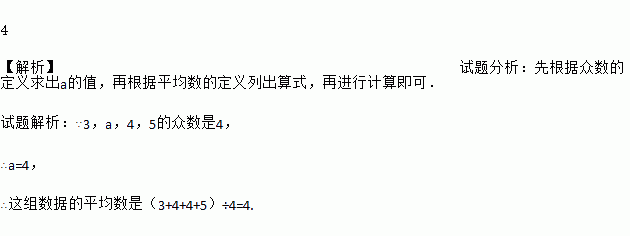 4 【解析】试题分析:先根据众数的定义求出a的值,再根据平均数的定义列出算式,再进行计算即可. 试题解析:∵3,a,4,5的众数是4, ∴a=4, ∴这组数据的平均数是(3+4+4+5)÷4=4.