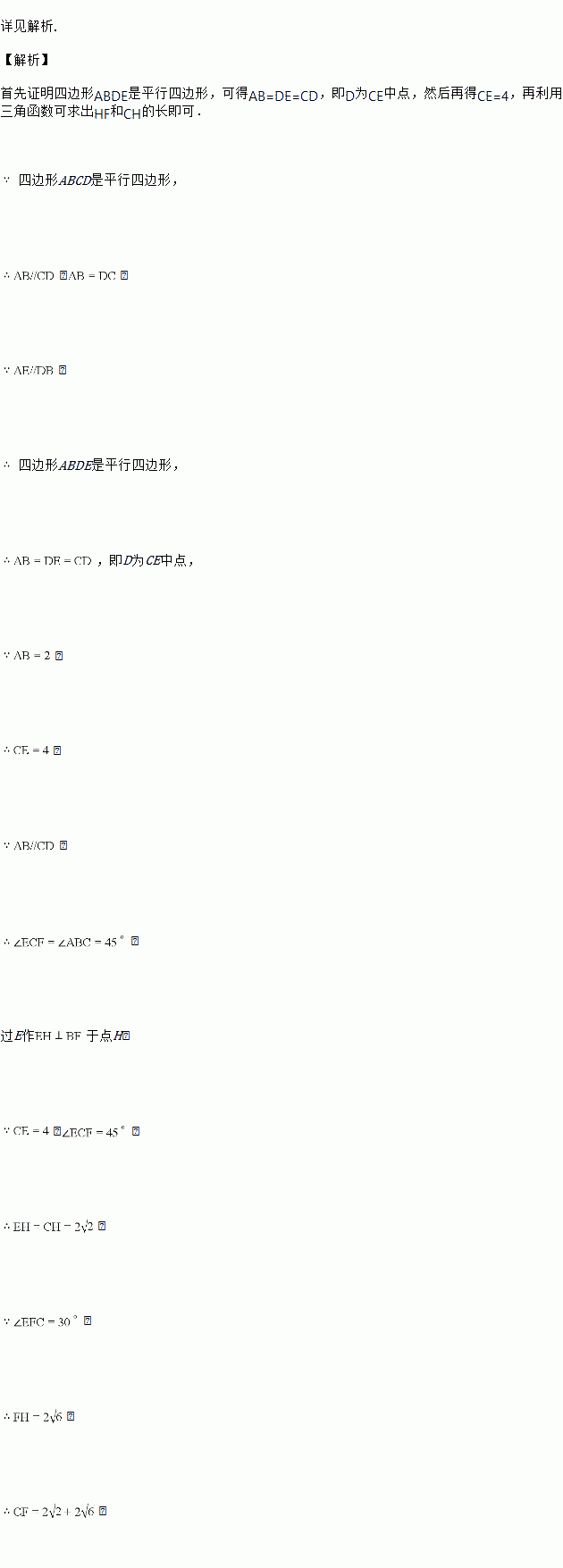 如图,在平行四边形ABCD中,,E、F分别在CD和BC的延长线上,,,求CF的长.