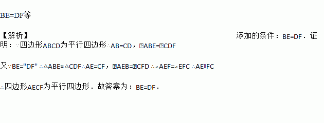 如图,在四边形ABCD中AB//CD,若加上AD//BC,则四边形ABCD为平行四边形。现在请你添加一个适当的条件:_____________________________,使得四边形AECF为平行四边形.( 图中不再添加点和线)