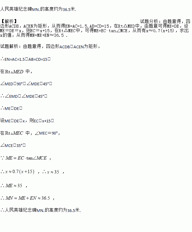 在北京市开展的“首都少年先锋岗”活动中,某数学小组到人民英雄纪念碑站岗执勤,并在活动后实地测量了纪念碑的高度. 方法如下:如图,首先在测量点A处用高为1.5m的测角仪AC测得人民英雄纪念碑MN顶部M的仰角为35°,然后在测量点B处用同样的测角仪BD测得人民英雄纪念碑MN顶部M的仰角为45°,最后测量出A,B两点间的距离为15m,并且N,B,A三点在一条直线上,连接CD并延长交MN于点E. 请你利用他们的测量结果,计算人民英雄纪念碑MN的高度.