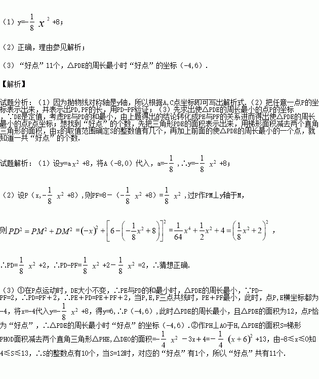 (3)小明进一步探究得出结论:若将“使△PDE的面积为整数”的点P记作“好点”,则存在多个“好点”,且使△PDE的周长最小的点P也是一个“好点”.请直接写出所有“好点”的个数,并求出△PDE的周长最小时“好点”的坐标.