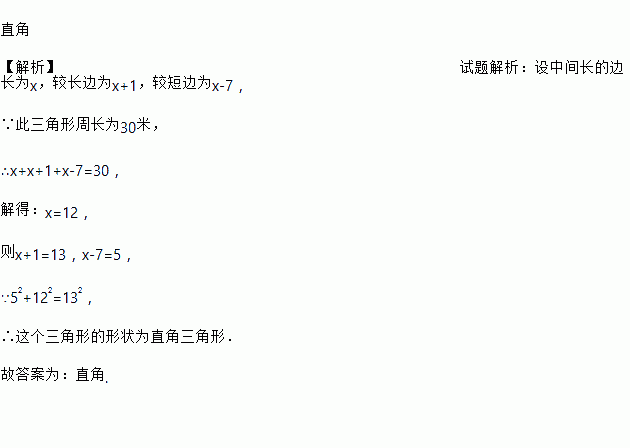把一根30米长的细绳折成3段,围成一个三角形,其中一条边的长度比较短边长7米,比较长边短1米,则这个三角形是_______三角形.