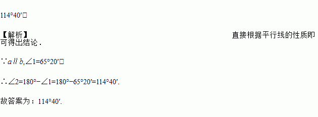 如图,已知 a∥b,∠1=65°20′,则∠2=________.