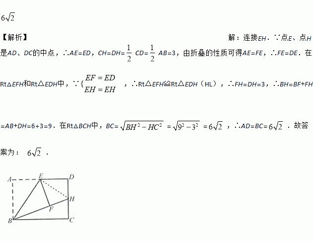 如图,在矩形ABCD中,AB=6,E,H分别为AD、CD的中点,沿BE将△ABE折叠,若点A恰好落在BH上的F处,则AD=____________。
