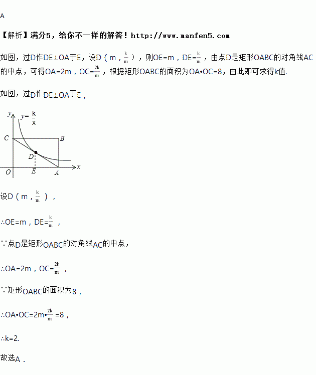 (k≠0,x>0)的图象经过矩形OABC的对角线AC的中点D.若矩形OABC的面积为8,则k的值为( )