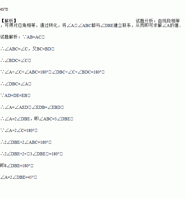 如图所示,点D在AC上,点E在AB上,且AB=AC,BC=BD,AD=DE=EB,求∠A的度数.