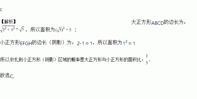 “赵爽弦图”是由四个全等的直角三角形与中间的一个小正方形拼成的一个大正方形(如图所示)。小亮同学随机地在大正方形及其内部区域投针,若直角三角形的两条直角边的长分别是2和1,则针扎到小正方形(阴影)区域的概率是( )