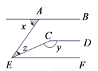 如图所示,已知AB∥CD∥EF, 则∠、∠、∠三者之间的关系是 .