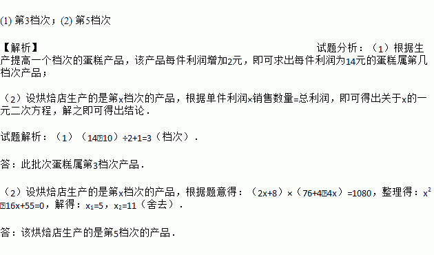 (1) 第3档次;(2) 第5档次 【解析】试题分析:(1)根据生产提高一个档次的蛋糕产品,该产品每件利润增加2元,即可求出每件利润为14元的蛋糕属第几档次产品; (2)设烘焙店生产的是第x档次的产品,根据单件利润×销售数量=总利润,即可得出关于x的一元二次方程,解之即可得出结论. 试题解析:(1)(14﹣10)÷2+1=3(档次). 答:此批次蛋糕属第3档次产品. ...